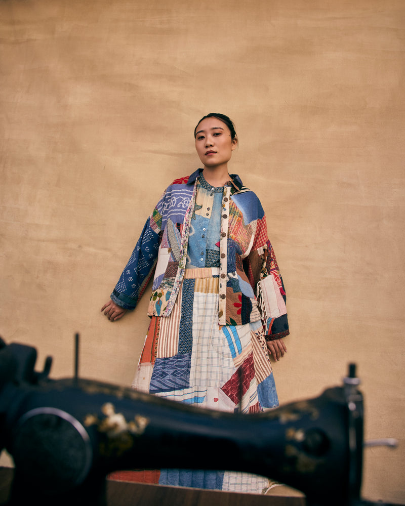 The collection started with a forgotten box in the studio filled with old samplepieces, cut panels, and abandoned ideas. Nothing matched. Nothing was planned. Whatlooked like clutter became the foundation. Sorting through these fragments forcedus to think differently, allowing what already existed to set the tone foreverything that followed.