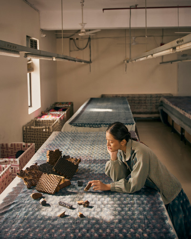 The fabric in this phase comes from the base cloth of the block-printing tables, material that quietly collects every colour, every imprint, every passing moment of the craft. With each new piece printed, another layer settles onto this cloth: stray dyes, half motifs, soft shadows of blocks that never became full patterns.When it becomes too stained, too layered, it is simply replaced and thrown aside.