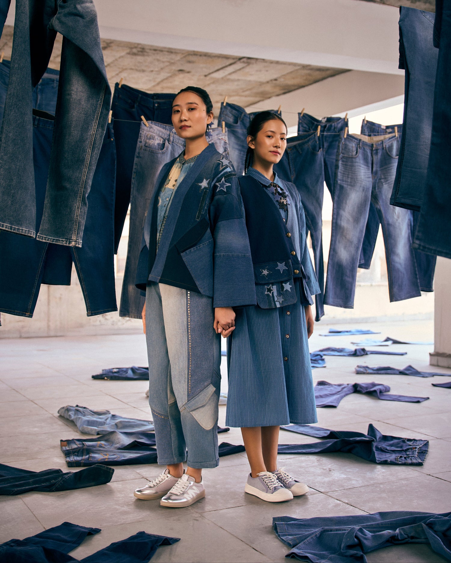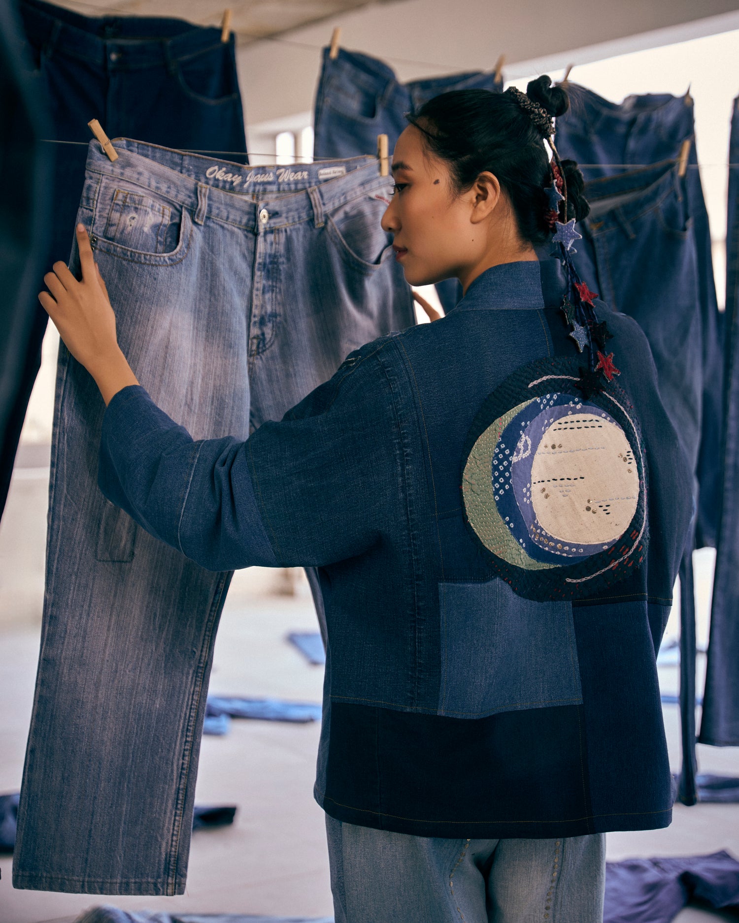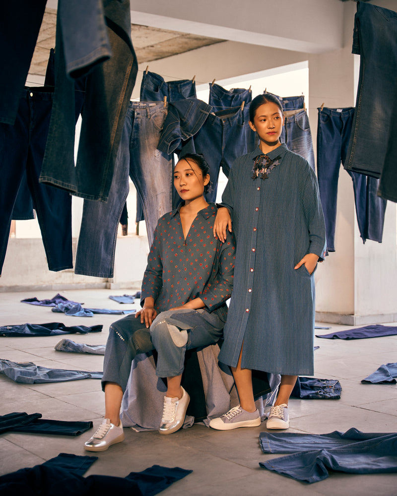 Denimhas a way of holding stories more than any other fabric, so this phase felt different. When we hung thediscarded jeans across the studio, the space changed, suddenly the room was full of shapes and shadows, almostlike people standing still after a long day. Washing and reviving each piece felt like caring for somethingthat had been overlooked. The garments born here feel familiar, lived-in, and gently restored.