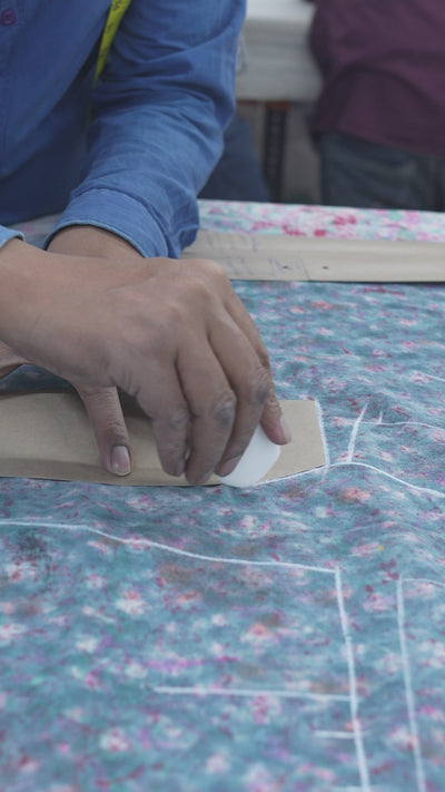 This relaxed easy bomber jacket is made from upcycled block printers’ table cloth and lined with soft kala cotton. It has a front zipper and a relaxed fit for natural movement. The yoke is decorated with galaxy-inspired metal sequins, hand-embellished one by one. Elasticated cuffs finish the sleeves, giving it a quiet, handcrafted character. Leftover fabric and careful handwork come together to make a jacket that carries its own story.